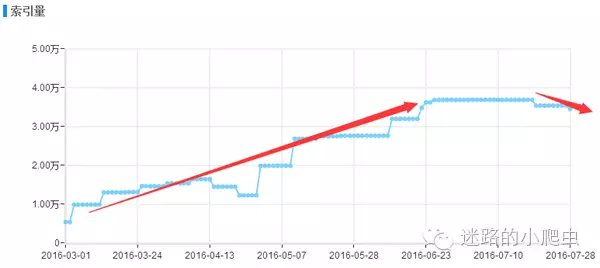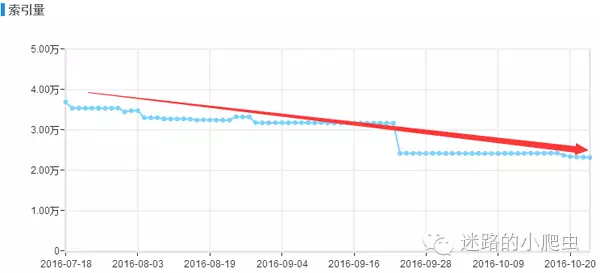 如上圖小編是今年三月份開始接手的這個網(wǎng)站項目,當(dāng)時并沒有通過逆向思維去解決網(wǎng)站存在的收錄問題,只是經(jīng)驗性的簡單分析了一下網(wǎng)站的日志,在站長后臺增加了sitemap推送和在服務(wù)器上部署了主動推送功能,短時間內(nèi)的確效果明顯,該頻道的頁面收錄呈現(xiàn)良好的上升趨勢,可是通過圖表可以看出,收錄量在達(dá)到6月份的時候一直到7月份中旬沒有進(jìn)行任何明顯的變化,從7月中旬之后小編當(dāng)時就有一種危機(jī)感,職業(yè)上的直覺告訴我,接下來一段時間該頻道的收錄會呈現(xiàn)大幅下降的趨勢,結(jié)果果不其然,如下圖: